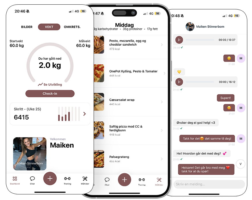 Opplev et coachingprogram designet for å passe dine unike behov. Hvert aspekt, fra måltidsplaner til treningsrutiner, er tilpasset din livsstil og dine preferanser. Denne helhetlige tilnærmingen sørger for at din treningsreise ikke bare er effektiv, men også morsom og bærekraftig, slik at du holder deg motivert og oppnår langsiktig suksess.